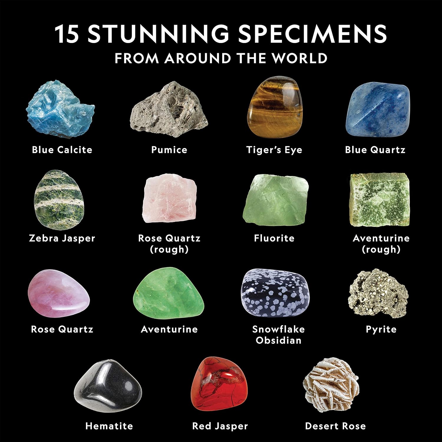 * AWESOME ROCKS AND MINERALS - This 15-piece rock collection features incredible rock and mineral specimens including desert rose, tiger's eye, red jasper, rose quartz, pyrite, green fluorite, blue quartz, green aventurine, and more!
