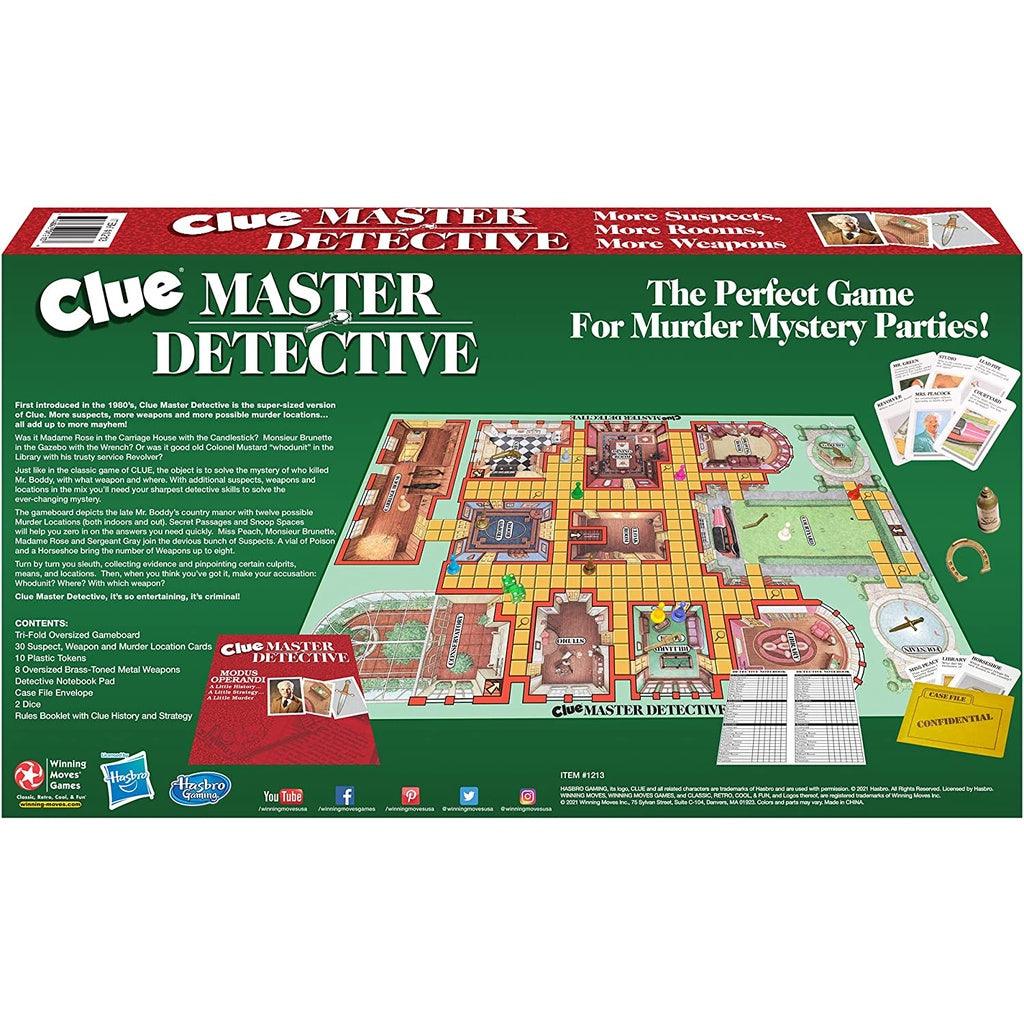 First Introduced in the 1980’s, Clue Master Detective is the super-sized version of Clue. More suspects, more weapons and more possible murder locations. all add up to more mayhem! Just like in the classic game of CLUE, the object is to solve the mystery of who killed Mr. Body, with what weapon and where. With additional suspects, weapons and locations in the mix you’ll need your sharpest detective skills to solve the ever changing mystery. Turn by turn you sleuth, collecting evidence and pinpointing certain culprits, means and locations. Then, when you think you’ve got it, make your accusation: Whodunit? Where? With which weapon? Clue Master Detective, it’s so entertaining, it’s criminal! Game contains: Tri-Fold Oversized Game Board; 30 Suspect; Weapons and Murder Location Cards; 10 Plastic Tokens; 8 Brass-Toned Metal Weapons; Detective notebook Pad; Case File Envelope; 2 Dice and Rules Booklet with Clue History and Strategy.