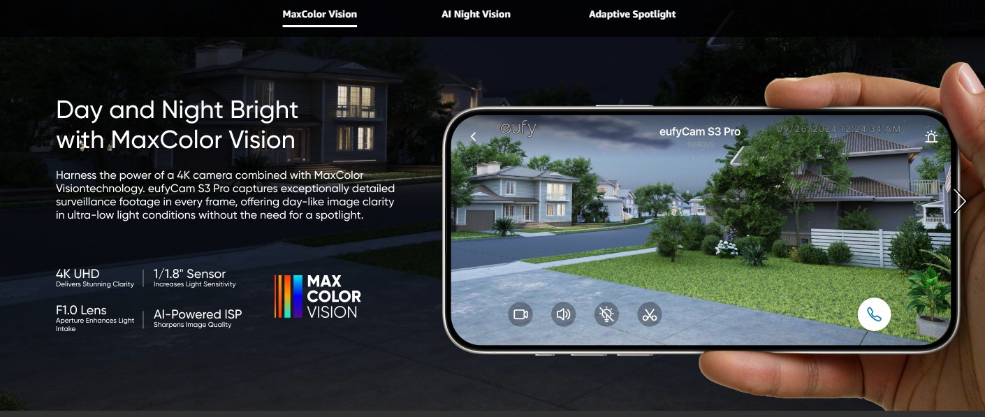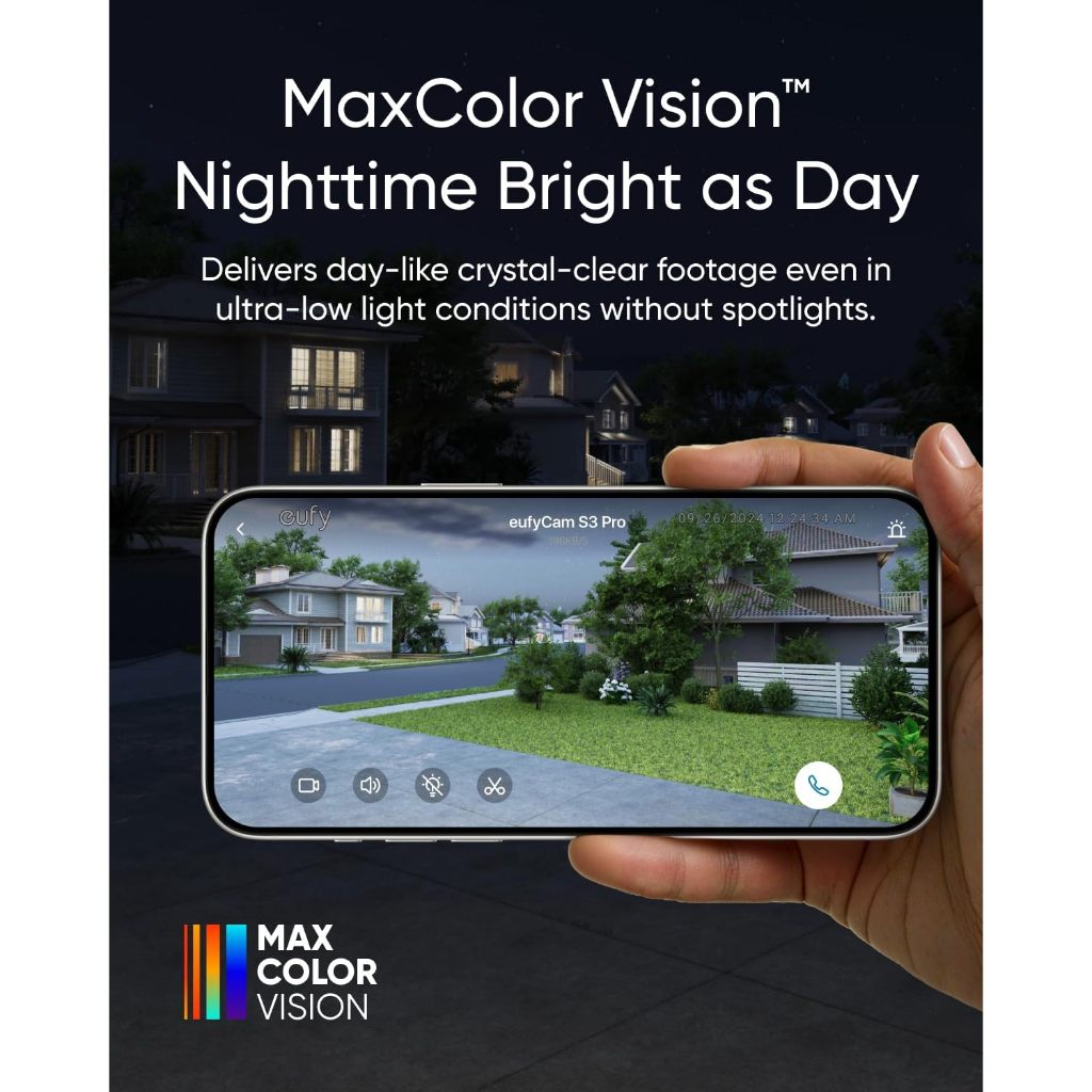 ✅Nighttime That's as Bright as Day: Harness the power of a 4K camera combined with MaxColor Vision technology. eufyCam S3 Pro captures exceptionally detailed surveillance footage in every frame, offering day-like image clarity even in ultra-low light conditions without the need for a spotlight.
