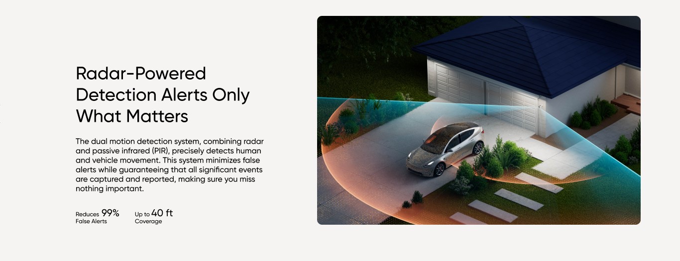 ✅Radar Powered Detection Alerts Only What Matters: The dual motion detection system, combining radar and passive infrared (PIR), accurately identifies human movement and reduces false alerts by 99%, guaranteeing that alerts are only triggered by major security events in specified areas.